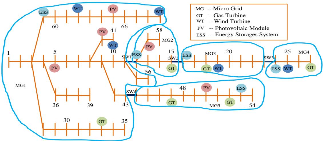 The well-known PG&E 69-bus power distribution system with five different microgrids is selected for simulations and case studies. The energy sharing from the distributed energy resources form multi-MGs for optimal operations of those energy resources. This research considers gas turbines, PVs, wind turbines, and energy storage systems inside microgrids to make the method practical. To create a sample multi-MG power distribution system, four arbitrary switches are allocated between the microgrids and the bus numbers 11-12, 15-16, 23-24, and 43-44. This four-switch positions make five microgrids. Further details on creating a multi-MG system in a power distribution grid can be found in [19]. The locations and capacities of each distributed energy resource are selected optimally based on minimizing multi-MG system losses and operating costs together. These locations are chosen for two different capacities of energy resources, 1125 kW and 2250 kW, shown in Table 1 and Table 2 in the results and discussion section. When the microgrids operate between themselves and share their energy based on energetic economic, available generations, etc., it's called multi-microgrids. A flexible boundary condition will allow the distributed energy resources to share their energy more efficiently. The multi-MG power distribution system's standard operational costs can be calculated by using per kWh per unit for 24 hours. Similar 24-hour periods are considered for the calculations of system losses and system environmental emissions, and the data is taken based on reference [24]. Since there are uncertainties in the load generation states, because of renewables generators and load variations, in this research, their corresponding uncertain behaviors are also considered to get faster, accurate results. Fig. 2 shows the system under study with a multi-MGs-based power distribution system having multiple distributed generators located inside the microgrids.