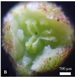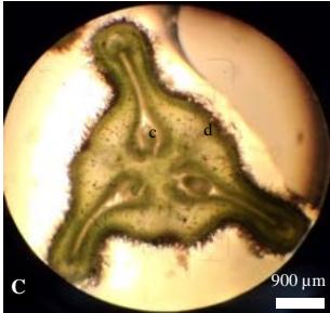 Figure 1: Floral traits: A: Female inflorescence, B: Opened female flower; C: sectionofthe female flower a: sepal; b: stigma; Cross-section, c: ovule; d: ovary