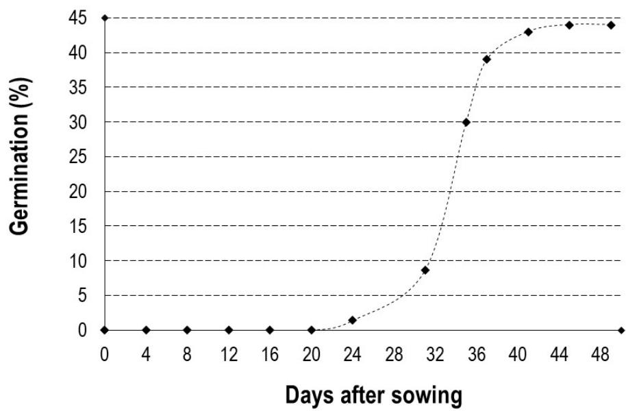 Artificially pollinated flowers developed into fruits (Figure 10). The germination kinetics of these seeds as a function of time is shown in Figure 11. During germination in $D$ dumetorum, the cotyledons remain buried in the soil, so germination is said to be hypogeal (Figure 12). The germination curve of $D$ dumetorum seeds as a function of time has a sigmoidal shape. $D$ dumetorum seeds start germinating after 23 days; this is the germination delay. After 23 days, the germination rate increases exponentially and most seeds germinate after 40 days. At 45 days after germination, the seeds do not germinate anymore; this is reflected in the horizontal shape of the curve, which marks the end of germination. The fruiting rate of the negative control flowers is almost zero because of the lack of pollination of their flowers before covering them with cloth.
