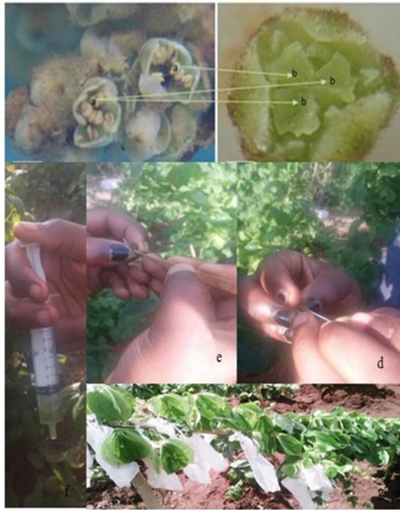 Figure 9: Illustration of pollination methods. Pollen collected on the anthers (a) and transferred to the stigma (b) during $D$. dumetorum pollination processes. This is done with the pollen solution (f), the bamboo splinter (e) or the metal brush (d). The pollination was followed by covering the pollinated female flowers with a white cloth (g).