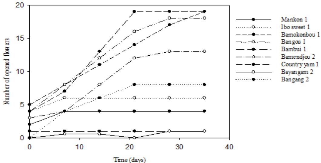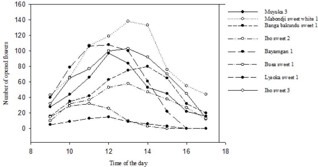 The opening of the female flowers in $D$. dumetorum occurs gradually during maturation. They become receptive after a certain point in the maturation process. Once opened, they do not close again until they turn brown. These flowers do not have a characteristic strong smell. The receptive female flower has prominent, colourful and spotless stigmas, is well open, the stigmas are clearly visible, separate and distinct. It remains in this morphological state for 5 to 7 days after which it turns brown and fades if not pollinated. A weekly count for more than a month of new receptive open female flowers in each variety shows that their number varies according to the variety; the number of open flowers is very irregular over time (Figure 5). The total number of opened flowers per hour between 9 a. m. and 5 p.m. was 4-6 days for male flower. For all accessions considered, maximum opening was observed between 11 a.m. and 2 p.m. Flowers opened in the morning (9 a.m.) and started to close by 5 p.m. in the evening (Figure 6). Zoundjihékpon and al 1997 (up cit) obtained similar result in their work with Dioscorea Cayenensis-rotundata. They reported a cultivar on which flowering last 8 days, with peak of flowering occurring between the fourth and eighth day.