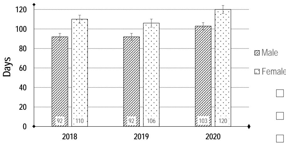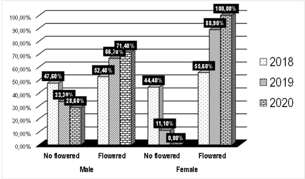 Figure 8: Maturation time of male and female flowers of $D$. dumetorum during the three years evaluation