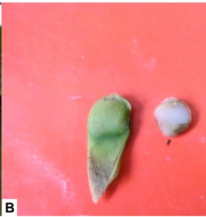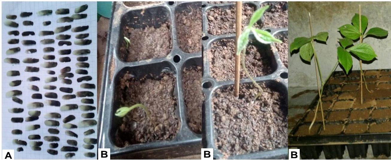 Figure 13: A- Mature seeds of D. dumetorumand B -hybrid seedlings at three stages of growth