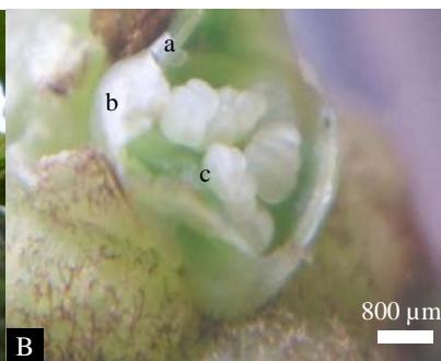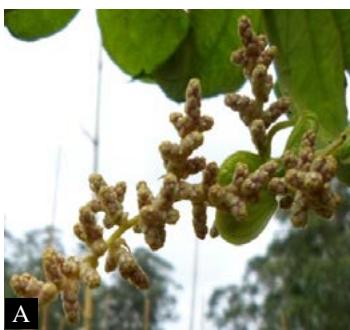 Figure 2: Floral trait, A: male inflorescence, B: opened male flower; a: sepal; b: petal; c: stamen