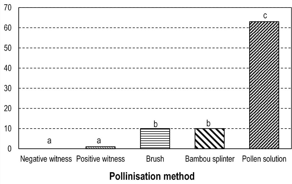 Results are indicated on figure 9. Significant effects were obtained while comparing different pollination technique (p < 0.05) with respect to fructification. No significant difference between the fruiting rates of the positive control (1%) and the negative control (0%) flowers was noted. The best result was obtained with the pollen solution (64%). which is highly superior to wire brush (9%) and the bamboo splinter (9%) methods. This confirms that the fruits formed on the artificially pollinated plants were indeed controlled and not subject to parthenogenesis. The plants in the positive control had a fruiting rate of $1.11\%$ and did not differ significantly from those in the negative control. They provide information on the efficiency of natural pollination, which in this case is low. This failure of natural pollination could be due to the absence of pollinating agents in our experimental site. These are insect pollinators such as Larothrips dentipes, Chirothrips sp., Haplothrips sp. and Xylocopas brasilianorum. Their absence could be due to environmental conditions that do not favour their development. The presence of insecticides sprayed in the experimental field possibly prevented the development and even the presence of these pollinating insects. The superiority of the pollination method involving the pollen solution over the pollination methods with the bamboo splinter and the metal brush could be due to the insufficient dehiscence of the anthers in the latter two methods. The crushing of the anthers during the preparation of the pollen solution must have caused the rupture of the anther and the release of the pollen into the solvent (rainwater). This pollen was certainly deposited directly on the stigma of the female flowers, using the syringe, and must have relatively favoured fertilisation and therefore fruiting. However, pollination with the bamboo splinter and the metal brush allowed the deposition of anthers on the stigma of female flowers; these anthers probably had not undergone sufficient dehiscence after their deposition in order to release the pollen. This lack of dehiscence in these two pollination methods possibly limited fertilisation and therefore fruiting, which was significantly lower than that observed in the case of pollination with the pollen solution. This fruiting rate of $64\%$ is much higher than those obtained in Nigeria on D. rotundata $(41.3\%)$ (Akoroda, 1985); on D. alata $(19.7\%)$ in Cote d'Ivoire (Ehounou and al, 2019) and are comparable to that obtained on D. alata $(74\%)$ (Abraham and al, 1990) in India.