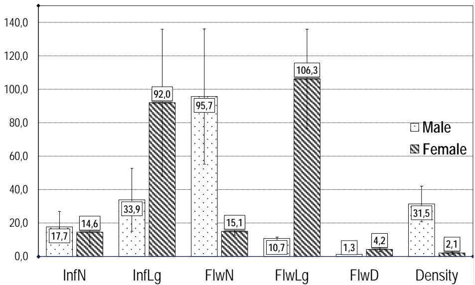 Figure 3: Male and female floral morphologic traits indicating the mean value of inflorescence number (InfN), Inflorescence length (InfLg), Flower number (FlwN), Flower length (Flwlg), Flower diameter (FlwD) and Density. Lengths are in milimeters. Bars are standard deviation. ANOVA indicates significant effect of sex on InLg, FlwN
