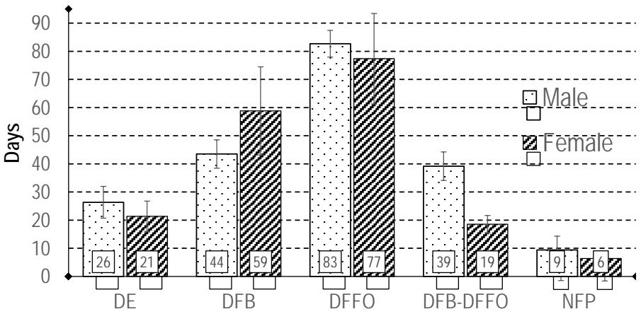 Figure 4: Flowering pattern of female and male flowers: Days to Emergence (DE), Days to first Bud Emergence (DBE), Days to First Flower Opening (DFFO), Days to emergence - First Bud emergence to First Flower Opening (DFB-DFFO) and Number of Flowering Plants (NFP). Bars indicate standard deviations.