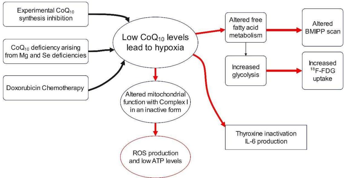29). The beta oxidation of free fatty acids constitutes the primary source of energy and ATP production in the heart (30). Once the oxidation of free fatty acids is diminished, glycolysis takes over in the failing heart (31). This is accompanied by increased glycolytic metabolism. Figure 3 shows summarily mechanisms of $\mathrm{CoQ}_{10}$ deficiency and their relation to metabolism and Nuclear Medicine diagnostic imaging.