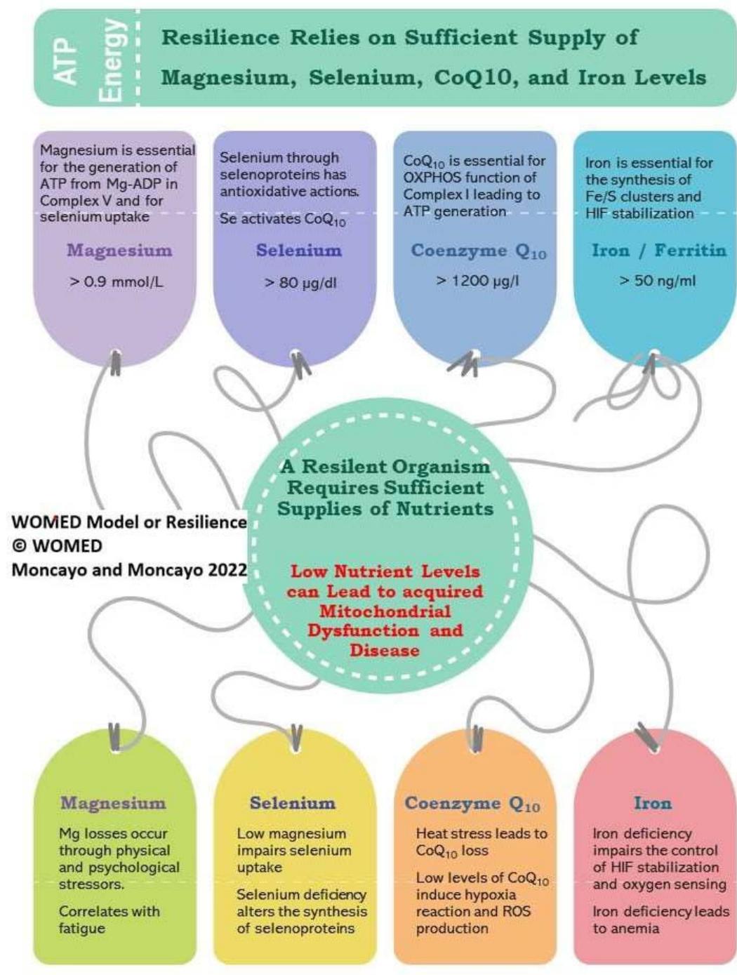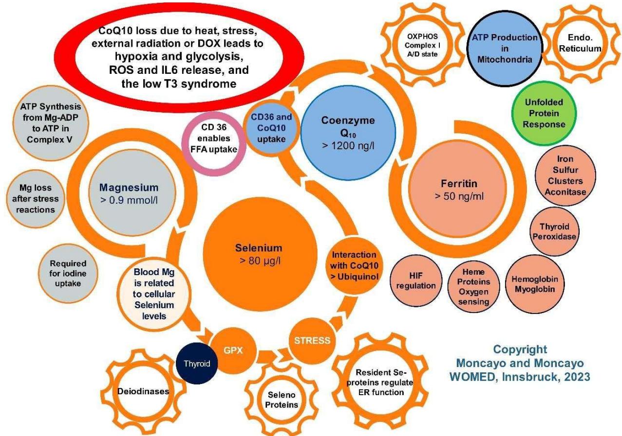 $\mathrm{CoQ}_{10}$, and ferritin in relation to mitochondrial function. Magnesium is required ATP synthesis, for iodine uptake, and selenium uptake. Selenium is the basic element of selenoproteins. Selenoproteins are related to the thyroid hormone deiodinases, to anti-oxidant functions, and to the endoplasmic reticulum as a resident element. Selenium is a key factor for maintaining $\mathrm{CoQ}_{10}$ levels. $\mathrm{CoQ}_{10}$ is the central element in Complex I of the OXPHOS chain and is maintained by CD36. Anti-oxidative actions of $\mathrm{CoQ}_{10}$ arise from the conversion of $\mathrm{CoQ}_{10}$ to ubiquinol, a process that requires selenium. Iron is essential for the synthesis of iron sulfur clusters which are constituents of many proteins of the OXPHOS chain. Furthermore, iron stabilizes the prolyl hydroxylases inhibiting the activation of HIF1. Desirable blood levels of the parameters are shown in the circles. The red circle signalizes the crucial situation of $\mathrm{CoQ}_{10}$ in the context of hypoxia.