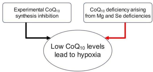 We have chosen to consider selenium and $\mathrm{CoQ}_{10}$ together based on observations made by Green et al., in 1961 (55) and by Hidiroglou in 1967 (56) who found a close functional relation between both substances such that selenium administration improved the tissue levels of $\mathrm{CoQ}_{10}$ in experimental animals. Vadhanavikit and Ganther published similar observations in 1993 and 1994 (57, 58). The authors speculated that lowering of $\mathrm{CoQ}_{10}$ levels depended on the depressed activity of GSH-Px which was the consequence of selenium deficiency (58). This finding implies that hypoxia can develop starting from selenium deficiency which then affects $\mathrm{CoQ}_{10}$ levels. Unfortunately, this important physiological connection has not been considered in many studies. Putting the focus only on one of these elements in the context of supplementation have remained inconclusive (59-61). On the other hand, specific single mechanisms can be indeed characterized.