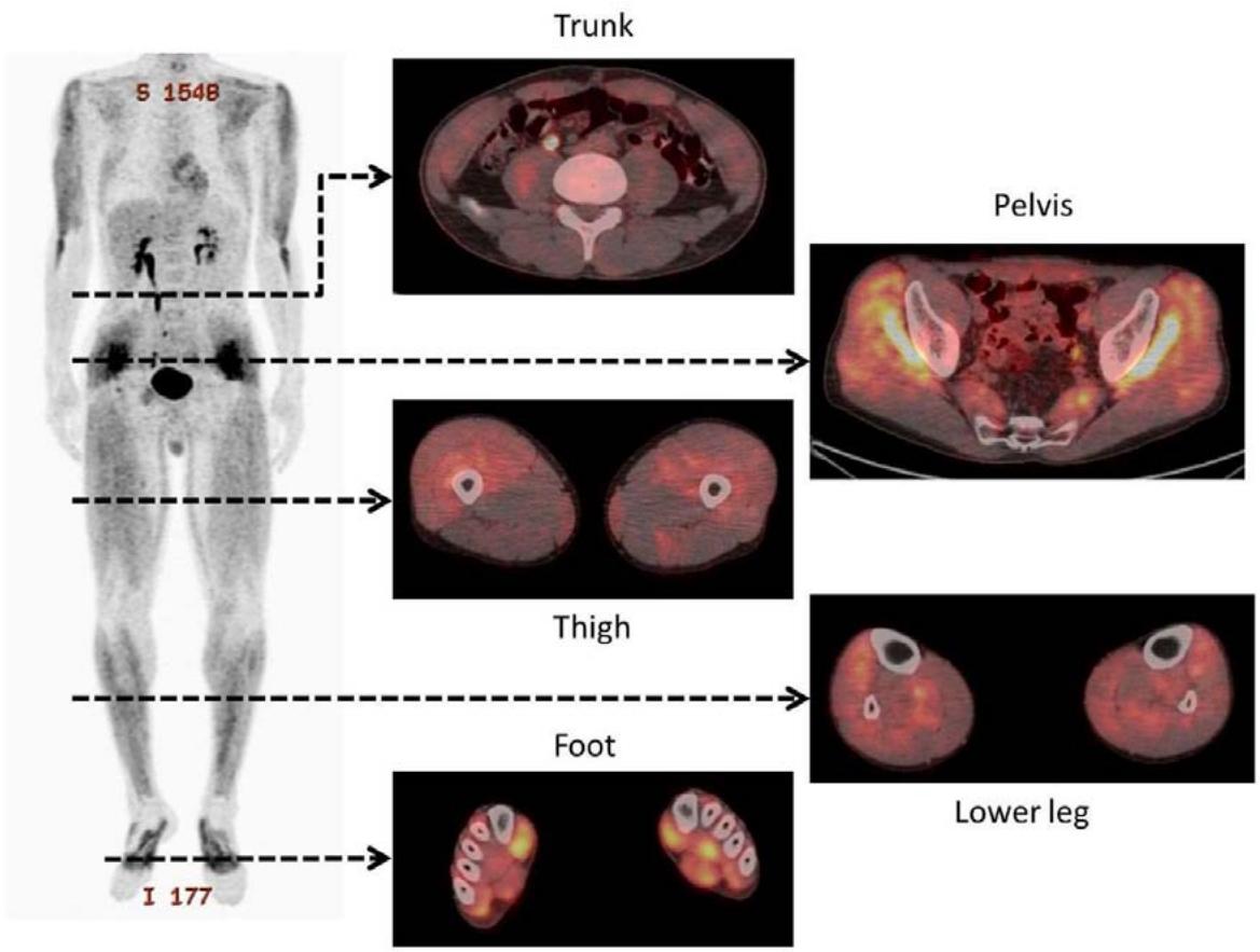 Nuclear Medicine diagnostic imaging based on the use of $^{18}\mathrm{F}$ -FDG PET has been primarily considered as a diagnostic method for oncological work (26). This rather restrictive notion emerged during the early years of clinical use of $^{18}\mathrm{F}$ -FDG when tracer availability and imaging capacity at specialized institutions were limited (26). Disregarding these conceptual and practical limitations, in 2003 we applied the methodology for the diagnosis of arteritis (27). Visualization of fatty acid oxidation can be achieved using the specific tracer $\left[{ }^{123} \mathrm{I}\right]$ - $\beta$ -Methyl iodophenyl-pentadecanoic acid (BMIPP) (28,