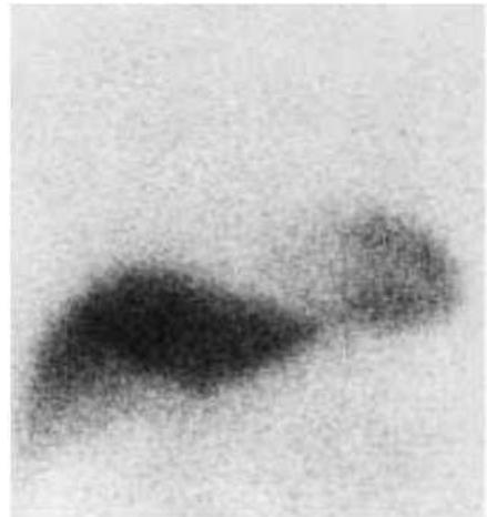 Fig. 2. Scintigraphic findings. Significantly more cardiac uptake of $^{123}\mathrm{I}$ BMIPP (H/M) was observed 3 months after treatment (right) than before treatment (left). H/M=1.99