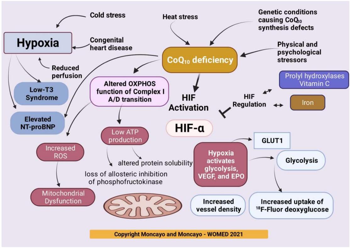 The scientific literature contains scarce information about $\mathrm{CoQ}_{10}$ and hypoxia in human disease. Hypoxemia is a recognized problem associated with congenital heart disease (158), and with viral infections (Figure 2 in (159), Figure 2 in (160)). The role of hypoxia in chronic kidney disease has been discussed by Wang et al., (161). Chen et al., depicted the progression of kidney disease linking hypoxia and fibrosis (Figure 4 in (162)). Hypoxia in the context of COVID-19 has been recently summarized by Østergaard in 2022 setting a focus on capillary changes (163).