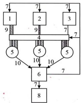 Here: 1 - container with reagents, 2 - energy source for starting the reaction, 3 - cooling system, 4 - control unit, 5 - chambers that make up the reactor, 6 - final energy device (steam generator or electrical transformer), 7 - channel energy supply, 8 - energy consumers, 9 - channels for supplying reagents and cooling, 10 - channels for removing energy from the chambers that make up the reactor.