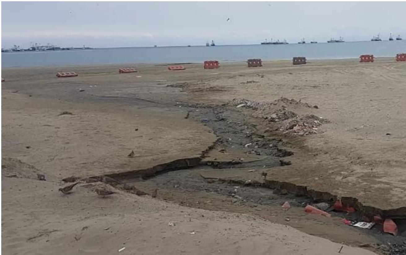Dentro de esta playa también es persistente el problema que afecta a la fauna marina (Reyes & Albino, 2020), así como a los habitantes y a los turistas que acuden a ella. Por la desembocadura del río Muerto en la playa, drenan desechos de algunas industrias o fábricas de aceite y procesadoras de atún, de tal manera que la contaminación es muy notoria, tal como se puede apreciar en las figuras 6 y 7.