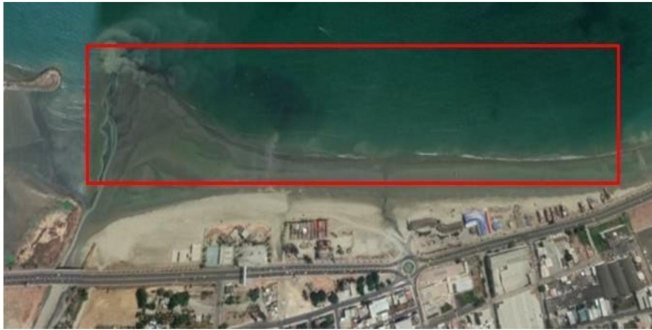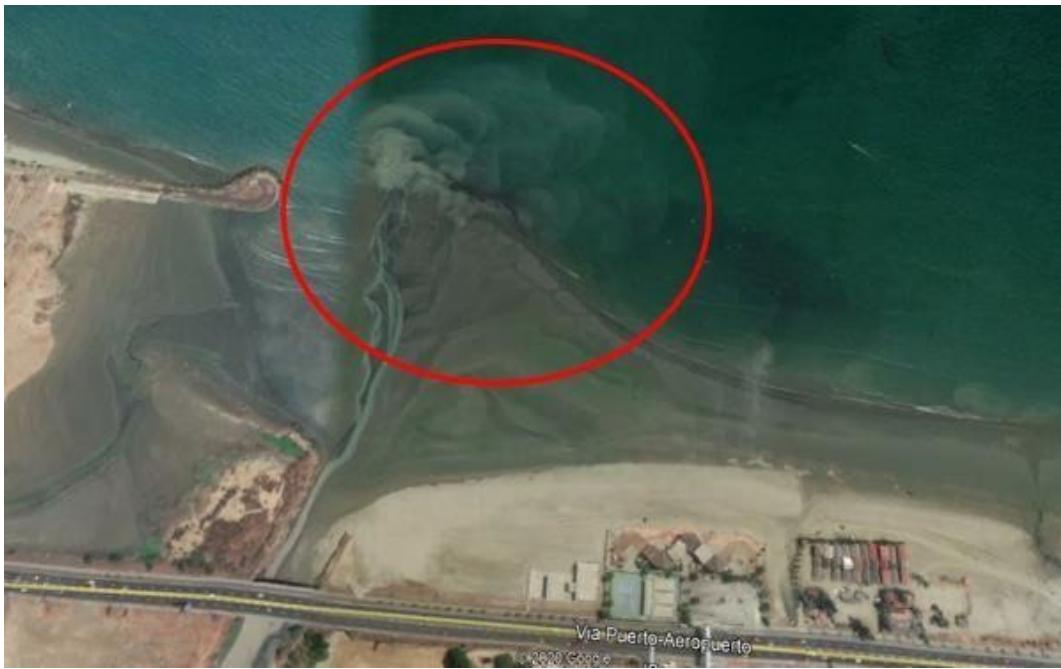 Fuente: Imagen cortesía de Google Earth 2020. Figura 8: Nótese en la zona demarcada en rojo la coloración turbia del agua en la playa como producto de la deposición de sedimentos por parte del río Muerto, especialmente en la temporada de lluvias.