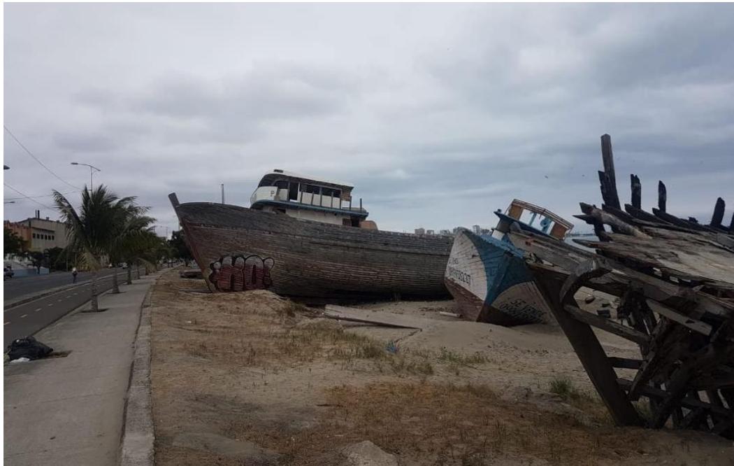 Entre otras actividades que producen contaminación en esta playa se puede mencionar el ruido que produce el tráfico vehicular durante todo el día, pues está separada de la avenida principal apenas por escasos metros. Adicionalmente en sus cercanías se encuentra operando un astillero (figura 5), que aun cuando puede servir de atractivo turístico, también es un foco de contaminación, pues en el marco de sus actividades se emplean productos químicos que alteran el ambiente y genera dañosal ecosistema.