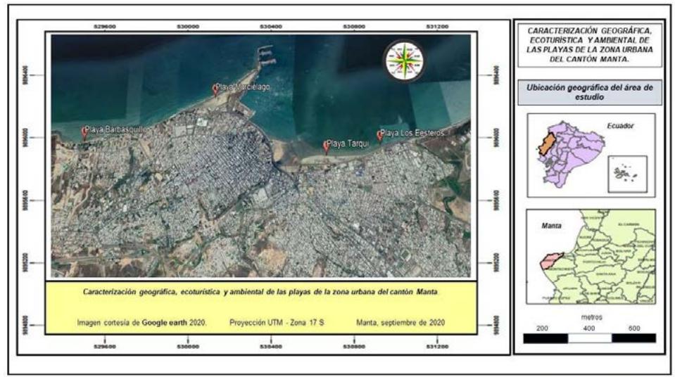 El área de estudio lo constituye las playas de la zona urbana del cantón Manta. Éstas se localizan en la provincia de Manabí, concretamente en el cantón Manta, el cual limita al Sur-Oeste con Montecristi y Jaramijó, entre las coordenadas geográficas ${ \mathsf { S } } 0 ^ { \circ } 57 ^ { \prime } 43$. $63 "$ de latitud Sur y los $080 ^ { \circ } 42 ^ { \prime } 45.76 ^ { \prime \prime }$ de longitud Oeste. Abarca una extensión territorial de 30.900 hectáreas (figura 1).