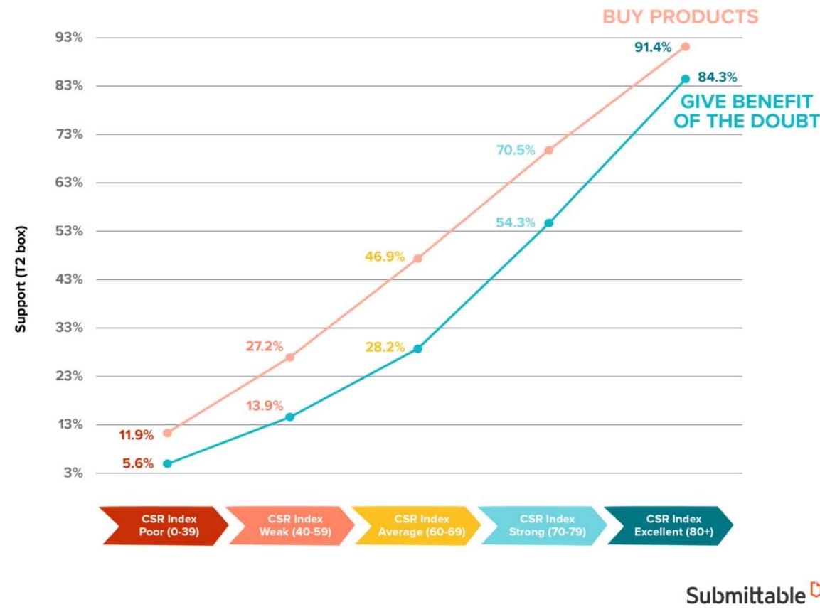 Supporting Kayla, Paul[^21], based on the data displayed in the given below graph (figure 4) states that over 91 percentage of those who surveyed lean towards buying from a company with excellent CSR, with that, over 84 percentage of the people surveyed said that companies with top-notch CSR gets the benefit of doubt during a crisis.