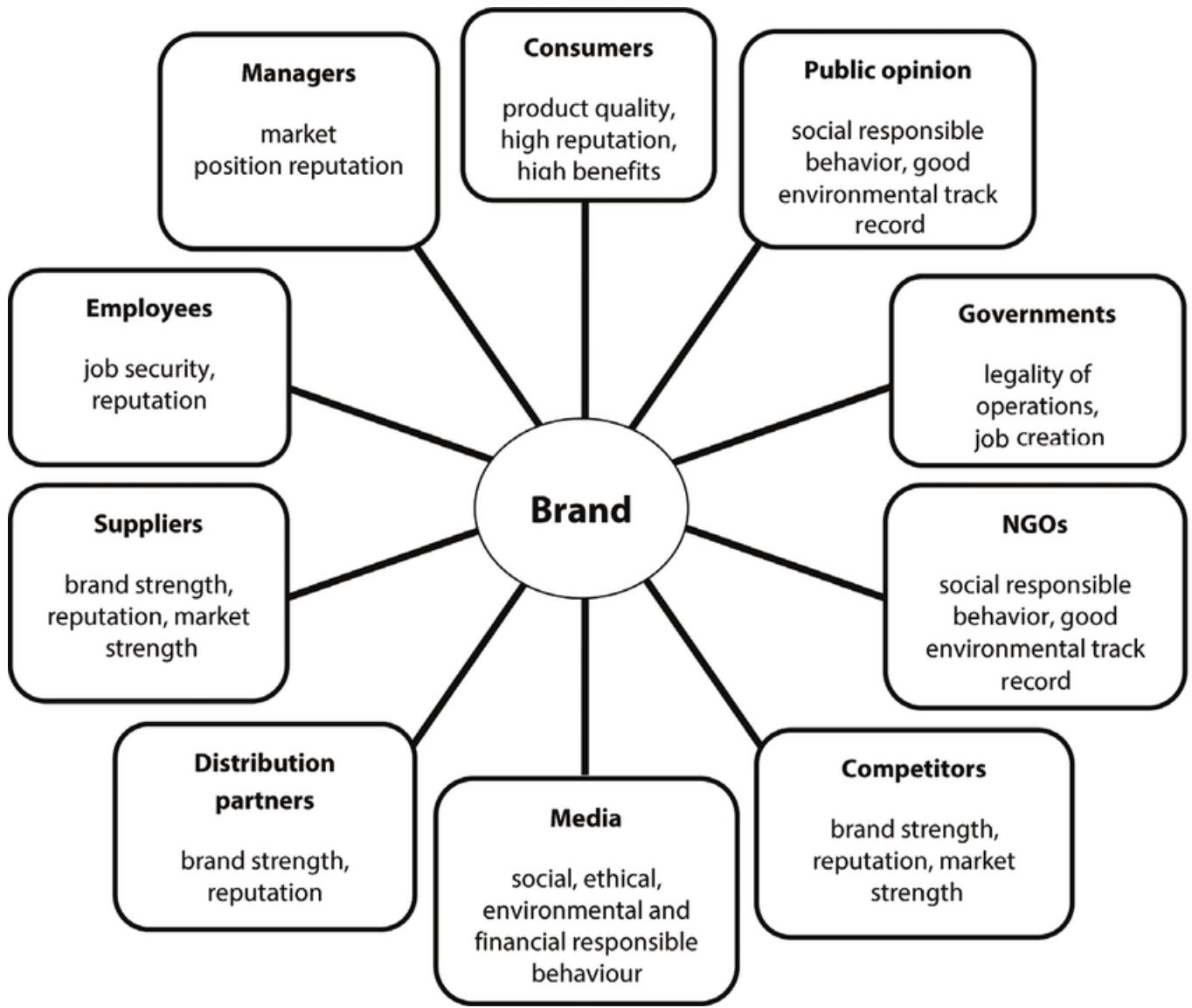 If brand equity equates to higher profit margins, the question arises if that is the case, does CSR help brand equity to ultimately have higher profit margins? The Daisy wheel model[^10] by Richard tells us that brand equity is linked with the stakeholder's expectations, one of the most important expectations is socially responsible behavior. Given below is the above-mentioned daisy wheel model for a better explanation.
