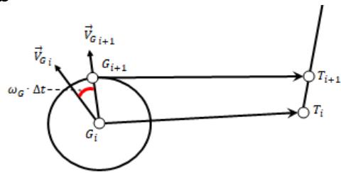 In our case, this is not the case. Let the catching object be located at some time $t_i$ at the point $G_i$, while having a velocity vector $\vec{V}_{G_i}$ (Fig. 3b). After a period of time $\Delta t$, the catching object rotates by an angle $\omega_G \times \Delta t$ and moves to a distance $V_G \cdot \Delta t$, where $\omega_G$ is the angular rotation frequency of the catching object. The angular rotation frequency can be interpreted as: