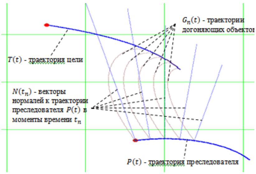 Fig. 1 is supplemented with an animated image [14], where it will be possible to see how from the pursuer's trajectory at certain intervals objects $G_{n}(t)$ are separated.