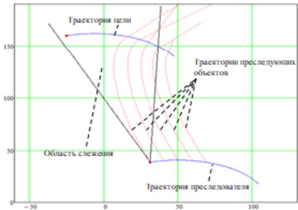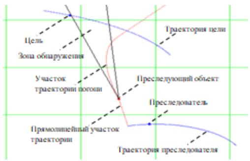 Each pursuing object has a detection area formed. In the model, for example, the area is formed as an angle with a vertex at the point where the object is located. The bisector of this angle coincides with the direction of the object's velocity.