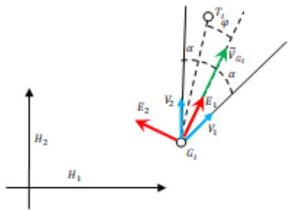 Modeling tracking angles of pursuing objects $G_{n}$ in the world coordinate system $(H_{1} \quad H_{2})$ is essentially a conversion vectors $\vec{V}_{1}$ and $\vec{V}_{2}$ from the coordinate system $(\vec{E}_{1} \quad \vec{G}_{i} \quad \vec{E}_{2})$ to the world.
