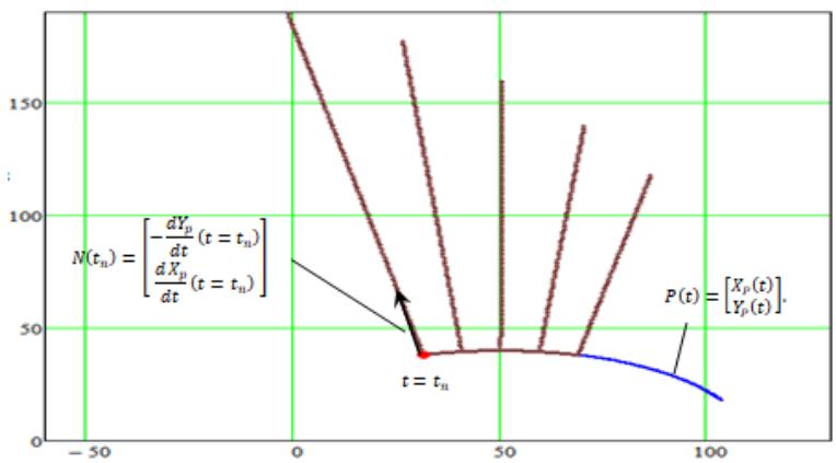 \vec {N} \left(t _ {n}\right) = \left[ \begin{array}{l} - \frac {d Y _ {p}}{d t} (t = t _ {n}) \\\frac {d X _ {p}}{d t} (t = t _ {n}) \end{array} \right]. \tag {1}