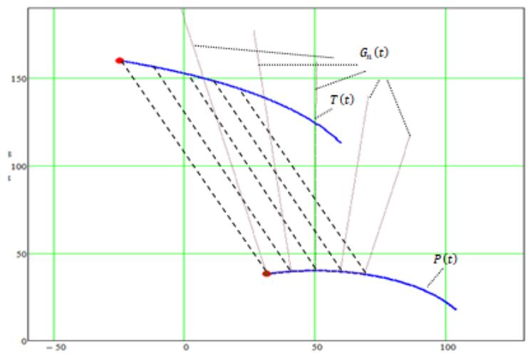 $\vec{T}(t)$ pursues $\vec{P}(t)$ by the method of parallel approach. Figure 2 is supplemented with an animated image [15], where it will be possible to see the movement on the plane of the target and the pursuer.