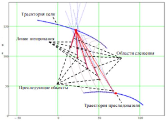 An animated image of the group pursuit of a single target by objects that descend perpendicular at certain intervals from the pursuer's trajectory was also produced [16].
