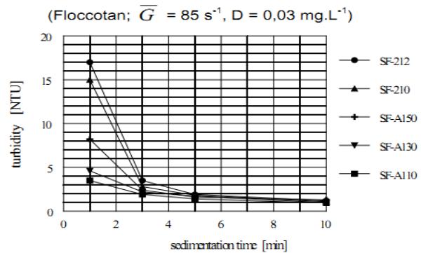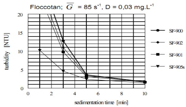 Different polyacrylamides available on market under the trade names of Superfloc, Magnafloc, Ultrafloc, BTI, and LTA, were tested. The method of their application is considered correct when the residual turbidity of the purified water produced by the separable and non-separable particles do not exceed the value obtained by the blind test after 60 min sedimentation. Since the character of results obtained with these polymers was practically the same, only the results obtained with the most efficient Superflocs are presented.