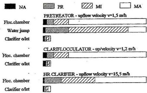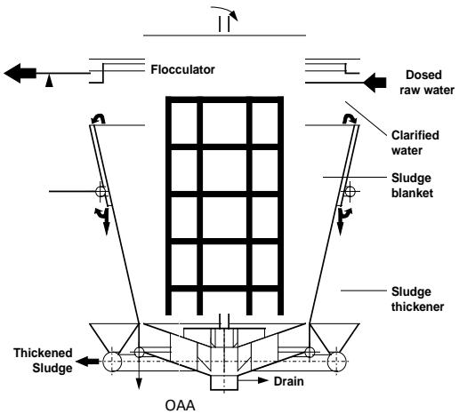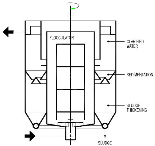 a) HR clarifier, a fully fluidized sludge blanket type, incorporating flocculation, sludge blanket, clarified water and sludge thickening compartments,