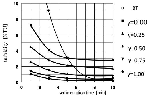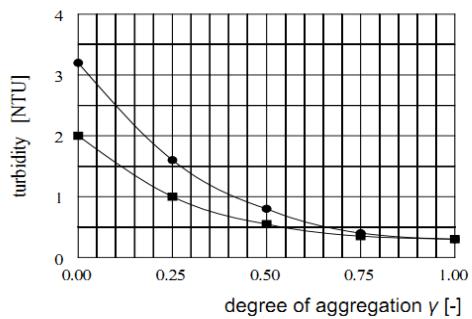 The formation of aggregates in different waterworks takes place under different hydrodynamic conditions and usually ends before the aggregation is completed. Therefore, to assess the state of aggregation achieved before the polymer addition a criterion called the Degree of Aggregation $\gamma$ was developed [1]. It is expressed with sufficient accuracy by the ratio of aggregation achieved at the point of polymer addition, characterized by $\overline{G} T_{A}$ and $\overline{G} T_{CA}$ at which aggregation is completed. The $\overline{G} T_{CA}$ value is aggregation agent dependent.