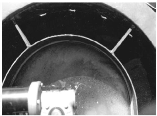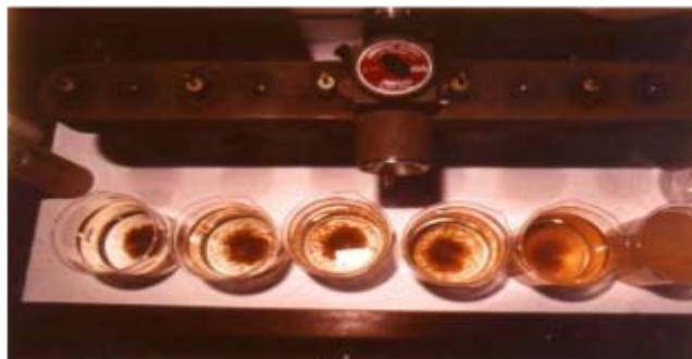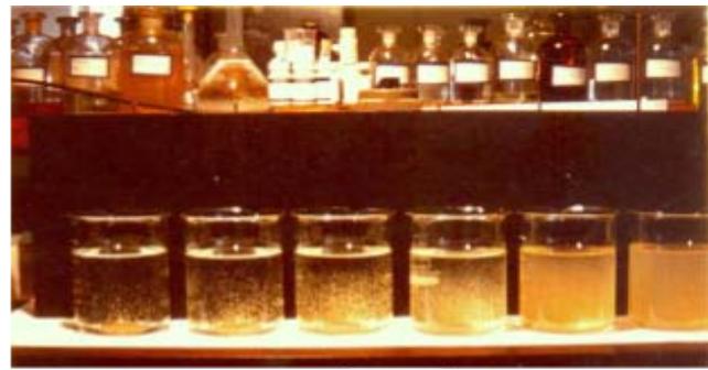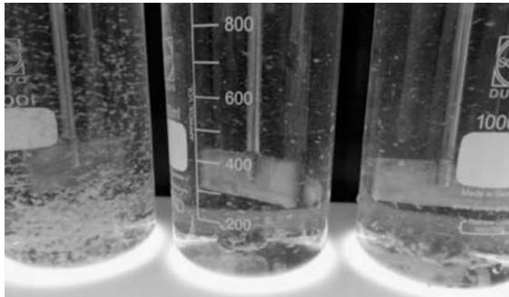 Figure 1: Suspension formed by the High Rate Clarification Technology – anionic polymer dosages from left to right: 0.1; 0.2 and 0.3 mg.L-1, picture taken at a stirrer speed of 27 RPM