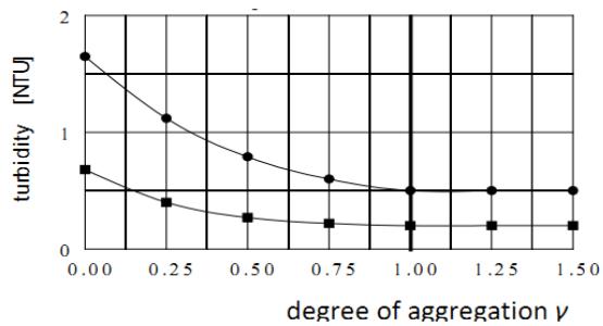 The degree of aggregation $\gamma$ permits quantification of the level of aggregation achieved at the time of polymer addition in comparison to completion of aggregation. If $\gamma = 1$ the aggregating system operates under optimized conditions and the best attainable quality of purified water attainable with the coagulant used, is produced. If $\gamma < 1$ the system is under-aggregated; this adversely affects the purified water quality. If $\gamma > 1$ the system is over-aggregated; the purified water quality is not adversely affected but the plant operates uneconomically at a higher power consumption.