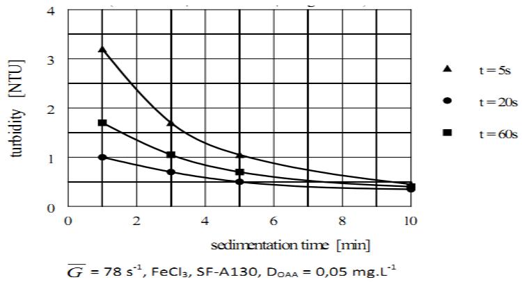 raw water. The flocculator was switched-on, stirrer speed set up to the maximum RPM and the position of individual beakers adjusted to produce the smallest vortex characterized by the smoothest water surface in each beaker. These operations were completed within a few seconds. The stirrer speed either remained the same or was reduced to the RPM generating the required $\overline{G}$. As mentioned in the foregoing, aggregation took place at a high agitation intensity of $\overline{G} \geq 50 \, \text{s}^{-1}$ over the entire aggregation. The aggregation time was measured from the moment the raw water was poured into the reaction beakers with the polymer dosage applied into the first beaker, $\gamma = 0$. As soon as the aggregation time corresponding to $\gamma = 0.25$, 0.50 and 0.75, the polymer solution was added to the second, third and fourth beaker respectively. As soon as the aggregation reached its completion, $\gamma = 1$, the polymer solution was dosed to the fifth beaker; the flocculator continued to operate at the same speed for another 20 seconds to facilitate homogenization of the polymer solution throughout the aggregated water. After this time the flocculator speed was reduced to an agitation intensity of $\overline{G} = 10 \, \text{s}^{-1}$ (27 RPM). Agitation continued at this low intensity for 4 minutes to enable agglomerates to fully develop. The flocculator was then switched-off, stirrers were removed immediately from all beakers, and the measurement of sedimentation time began. The samples of purified water were taken after 1, 3, 5, 10 and 30 minute sedimentation and sample from the blind test also after 60 minutes sedimentation. The samples of water were taken with a pipet from a depth of $30~\mathrm{mm}$ below the water surface; this was usually completed within 15 seconds.