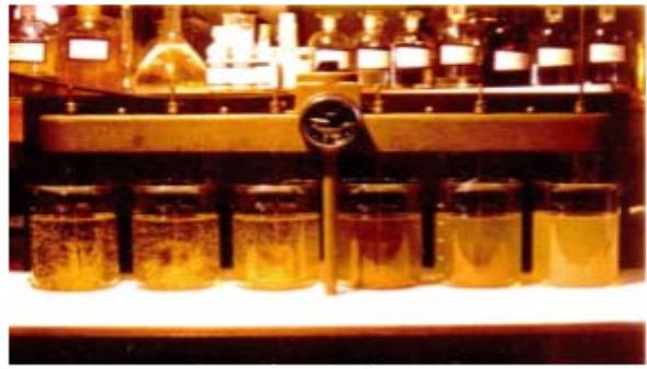 All jar tests used 2-liter standard Pyrex beakers with a 1.5 litre volume of raw water. The stirrer is a double paddle type with a spinning diameter $d = 62$ mm and a height $h = 58$ mm.