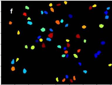 Figure 1a: Original image of breast cancer tissue Figure 1b: Figure 1a converted to greyscale Figure 1c: Figure 1b with inverted intensities Figure 1d & e: Initial identification of nuclei Figure 1f: Remaining objects after filtering for subsequent analysis