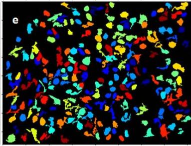 An image filtering was used to suppress changes that could interfere in the primary object analysis, eliminating the artifacts and preserving only the cell nuclei (Figure 1e).