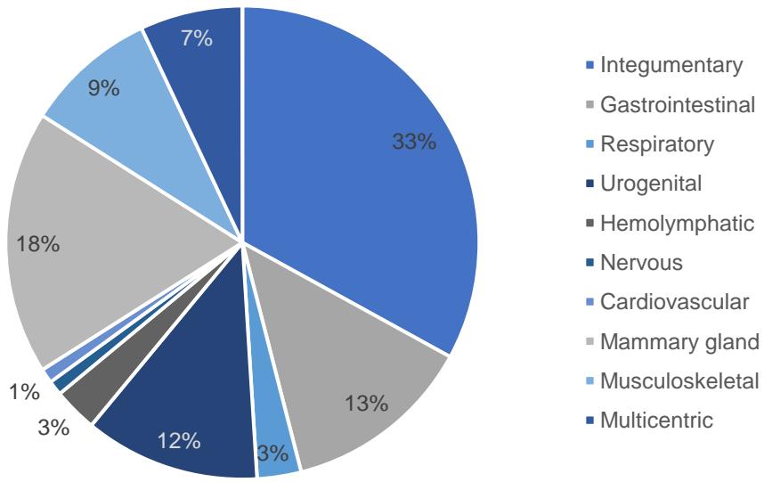 Regarding the affected body systems, there was a greater number of cases in the integumentary system and soft tissues (33%), followed by the mammary gland (18%), gastrointestinal system (13%), urogenital (12%), musculoskeletal (9%), multicentric (7%), respiratory (3%), hemolymphatic (3%), cardiovascular (1%), and nervous (1%). (Figure 1).