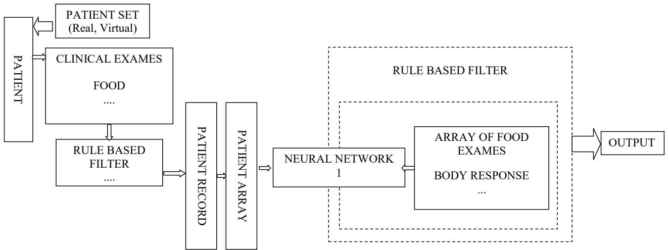 The information and the result of the correct training of the NN $n^{\circ}1$ of the successful learning of the diet-patient pairing; and up to this point after having carried out the training: then an average of the input vectors of the arrays of the patients and their diets is made and the significant food could be hidden, in truth the input of interest appears: then a new case is presented and at this point the network will say the most mylinizing diet and the difference is made between the representative vector of the new case minus the average of the patients, then we will see what are the variables in play that determine this difference between the representative vectors. The schemes proposed in fig. 1 and 2 should be considered a common place that can also be used for other pathologies, this aspect is very important to underline.