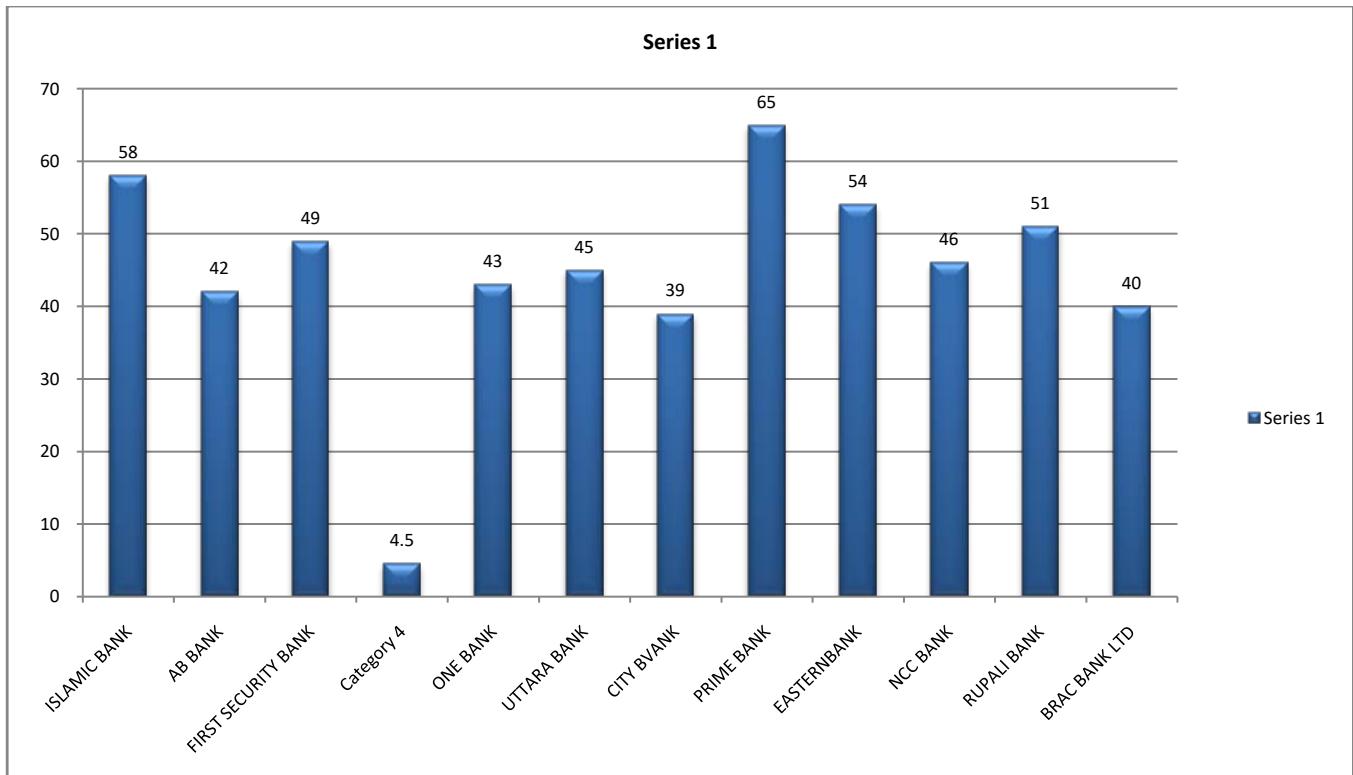 <table><tr><td>Rank</td><td>Bank Name</td><td>Total score</td><td>Percentage</td><td>Rank</td><td>Bank Name</td><td>Total Score</td><td>Percentage</td></tr><tr><td>1</td><td>Prime Bank Ltd</td><td>65</td><td>82.28</td><td>12</td><td>Mercantile Bank</td><td>47</td><td>59.49</td></tr><tr><td>2</td><td>Southeast Bank Ltd</td><td>63</td><td>79.75</td><td>12</td><td>NCC Bank Ltd</td><td>46</td><td>58.23</td></tr><tr><td>3</td><td>Trust Bank Ltd</td><td>60</td><td>75.94</td><td>13</td><td>Uttara Bank Ltd</td><td>45</td><td>56.96</td></tr><tr><td>4</td><td>SJIBL Ltd</td><td>59</td><td>74.68</td><td>14</td><td>SIBL</td><td>44</td><td>55.70</td></tr><tr><td>5</td><td>Dhaka Bank Ltd</td><td>58</td><td>73.42</td><td>15</td><td>Bank Asia Ltd</td><td>43</td><td>54.43</td></tr><tr><td>6</td><td>IBBL</td><td>58</td><td>73.42</td><td>15</td><td>One Bank Ltd</td><td>43</td><td>54.43</td></tr><tr><td>7</td><td>Mutual Trust Bank</td><td>56</td><td>70.87</td><td>15</td><td>Pubali Bank Ltd</td><td>43</td><td>54.43</td></tr><tr><td>8</td><td>Eastern Bank Ltd</td><td>54</td><td>68.35</td><td>16</td><td>AB Bank Ltd</td><td>42</td><td>53.16</td></tr><tr><td>8</td><td>Jamuna Bank Ltd</td><td>53</td><td>67.09</td><td>16</td><td>IFIC Bank Ltd</td><td>42</td><td>53.16</td></tr><tr><td>9</td><td>Premier Bank Ltd</td><td>52</td><td>65.82</td><td>17</td><td>PUBLIC Bank</td><td>41</td><td>51.90</td></tr><tr><td>9</td><td>Rupali Bank Ltd</td><td>51</td><td>64.56</td><td>18</td><td>BRAC Bank Ltd</td><td>40</td><td>50.63</td></tr><tr><td>10</td><td>FSIB Ltd</td><td>49</td><td>62.03</td><td>19</td><td>City Bank Ltd</td><td>39</td><td>49.37</td></tr><tr><td>10</td><td>UCBL</td><td>49</td><td>62.03</td><td>19</td><td>ICB Islami Bank</td><td>39</td><td>49.37</td></tr><tr><td>11</td><td>JANATA BANK</td><td>48</td><td>60.76</td><td>20</td><td>EXIM Bank Ltd</td><td>38</td><td>48.10</td></tr><tr><td>12</td><td>Dutch -Bangla Bank</td><td>47</td><td>59.49</td><td>20</td><td>Standard Bank Ltd</td><td>38</td><td>48.10</td></tr></table>