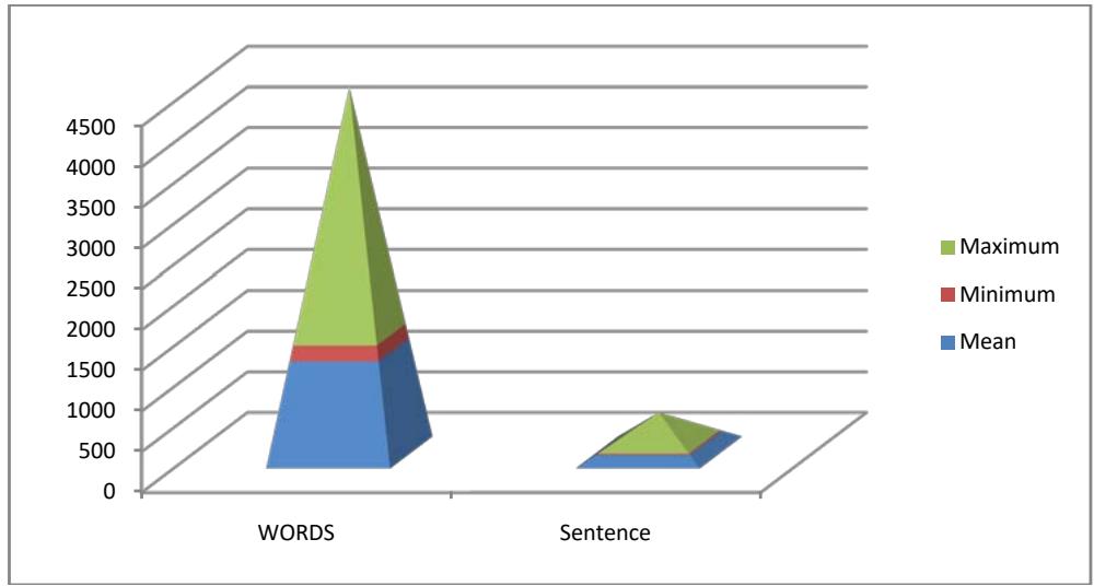 <table><tr><td></td><td>Word</td><td>Sentence</td></tr><tr><td>Mean</td><td>1264.33</td><td>118.83</td></tr><tr><td>Minimum</td><td>187.00</td><td>11.00</td></tr><tr><td>Maximum</td><td>3034.00</td><td>363.00</td></tr></table>