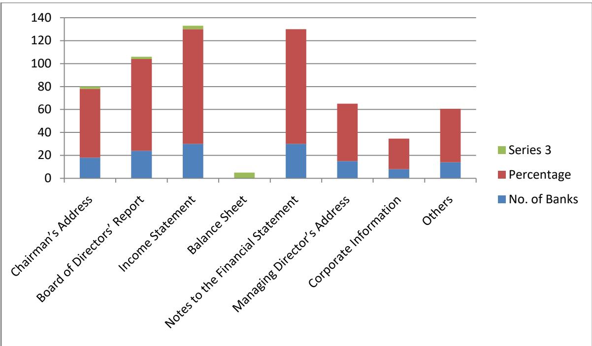 <table><tr><td>Location</td><td>No. of Banks</td><td>Percentage</td></tr><tr><td>Chairman's Address</td><td>18</td><td>60.00%</td></tr><tr><td>Board of Directors' Report</td><td>24</td><td>80.00%</td></tr><tr><td>Income Statement</td><td>30</td><td>100.00%</td></tr><tr><td>Balance Sheet</td><td>00</td><td>00%</td></tr><tr><td>Notes to the Financial Statement</td><td>30</td><td>100.00%</td></tr><tr><td>Managing Director's Address</td><td>15</td><td>50%</td></tr><tr><td>Corporate Information</td><td>8</td><td>26.66%%</td></tr><tr><td>Others</td><td>14</td><td>46.67</td></tr></table>