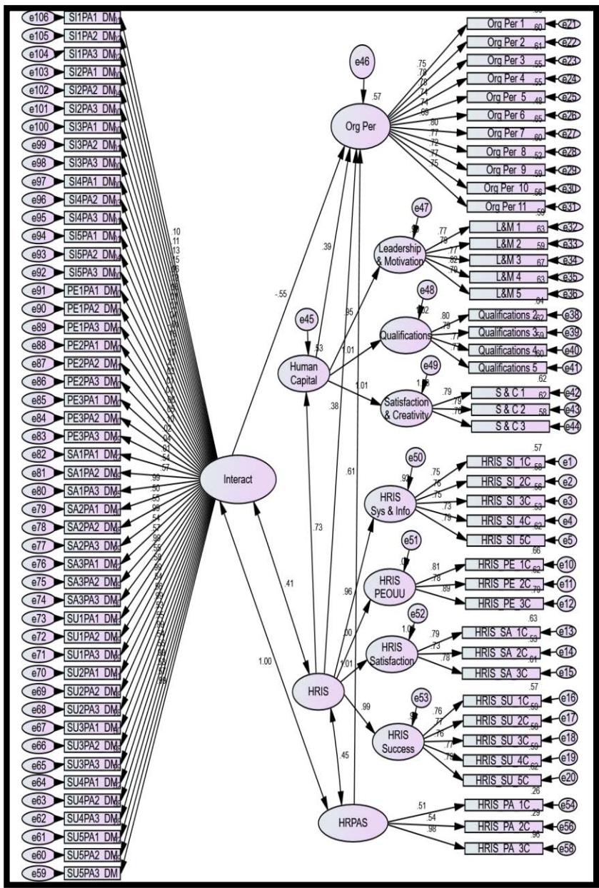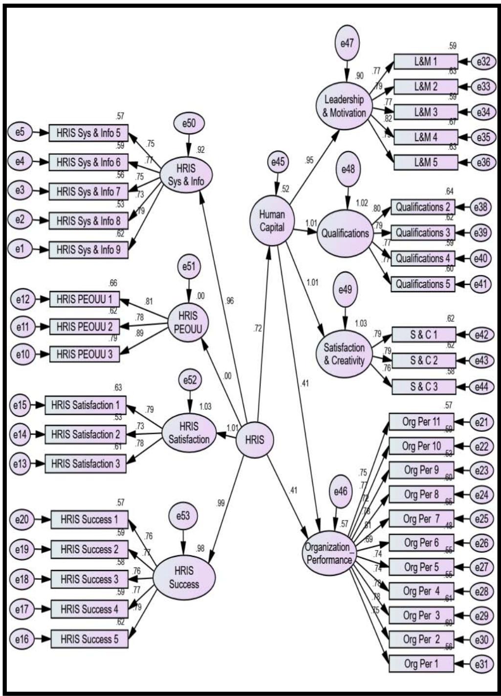 In addition to the descriptive analysis applied in order to understand better the characteristics of the sample, statistical tests of SEM were used to examine the relation amid the independent variable HRIS and dependent variable O.P through the mediator variable HCin presence of moderating variable (HR Analytics).