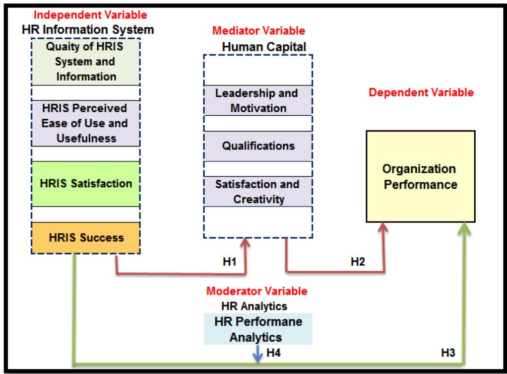 - Previous researches investigated the effect of HRIS on H.C hand other studies examined the Effect of H.C on O.P. Yet, there was no clear linkage between HRIS and O.P through the H.C, and negligible researches on the impact of HR Analytics on the relation between HRIS and O.P. Accordingly, the study at hand investigates the impact of HRIS perception on Organizational Performance and the mediating role of H.C together with the moderating impact of HR Analytics in Egyptian Private Sector Telecom Firms.
