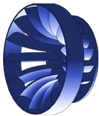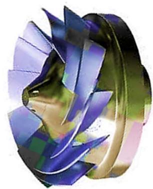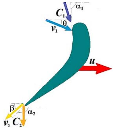 Сегодня «испытания» концепта начинают с компьютерной модели, выполняя структурный анализ (ставшим ведущим методом конечных элементов – FEA, широко применяющимся в расчёте плотин) весовых характеристик конструкции, отдельных деталей элементов, например, лопастей, применяя вычислительную гидродинамику (CFD) для оценки набегания и взаимодействия потока с граничными поверхностями. Кинематическая характеристика движения потока рабочего колеса описывается производными физическими величинами передачи скорости потока – скорость на входе лопатки, скорость на выходе, скорость самой лопатки. Лопатка таким образом определяет диаметр колеса и размер турбины вне зависимости от импульсной/реактивной, лопасти колеса неподвижные, то есть угол их наклона не может изменяться(на рис. 10 показана изогнутая лопасть с входом и выходом струйного потока под заданными углами).