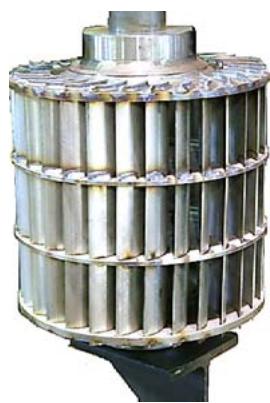 Рабочие скорости приливного течения – $2 { - } 3 \ \mathrm { { _ { M } / c } }$ (дают 4-13 $\mathbf { \kappa } _ { \mathrm { K B T } } \mathbf { \dot { / } _ { M } } ^ { 2 },$, большие $^ { ( > 3,0 ) }$ оказывают чрезмерную нагрузку на оборудование – на рабочее колесо, меньший напор – экономически неэффективен, напор определяет тип роторной турбины с характерным рисунком гидродинамического профиля лопатки; применение средне и высоконапорных требует конструкторских доработок, экономических обоснований. Таким образом, первую проблему можно интерпретировать как создание эффективных, надёжных приливных агрегатов и их совершенствование: 1) турбина Савониуса (рис. 2) с рабочим колесом обычно 2-4 лопасти отличается от колбовой ротором двигателя на внешнем контуре рабочего колеса и статором в
