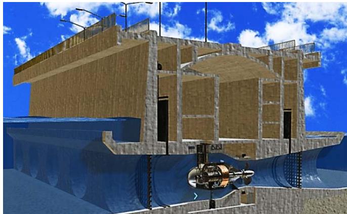 Рис. 9: 3-Дмодель sаVRее обычного заграждения ПЭC с в ряд расположенными турбинами